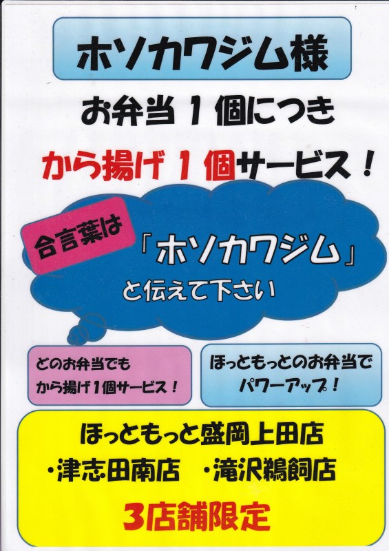 スポンサーのホットモット盛岡上田店・津志田店・滝沢鵜飼店の3店舗で【HOSOKAWAジム】と伝えると唐揚げが1個サービスされます。